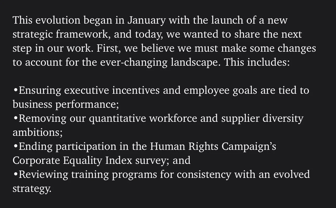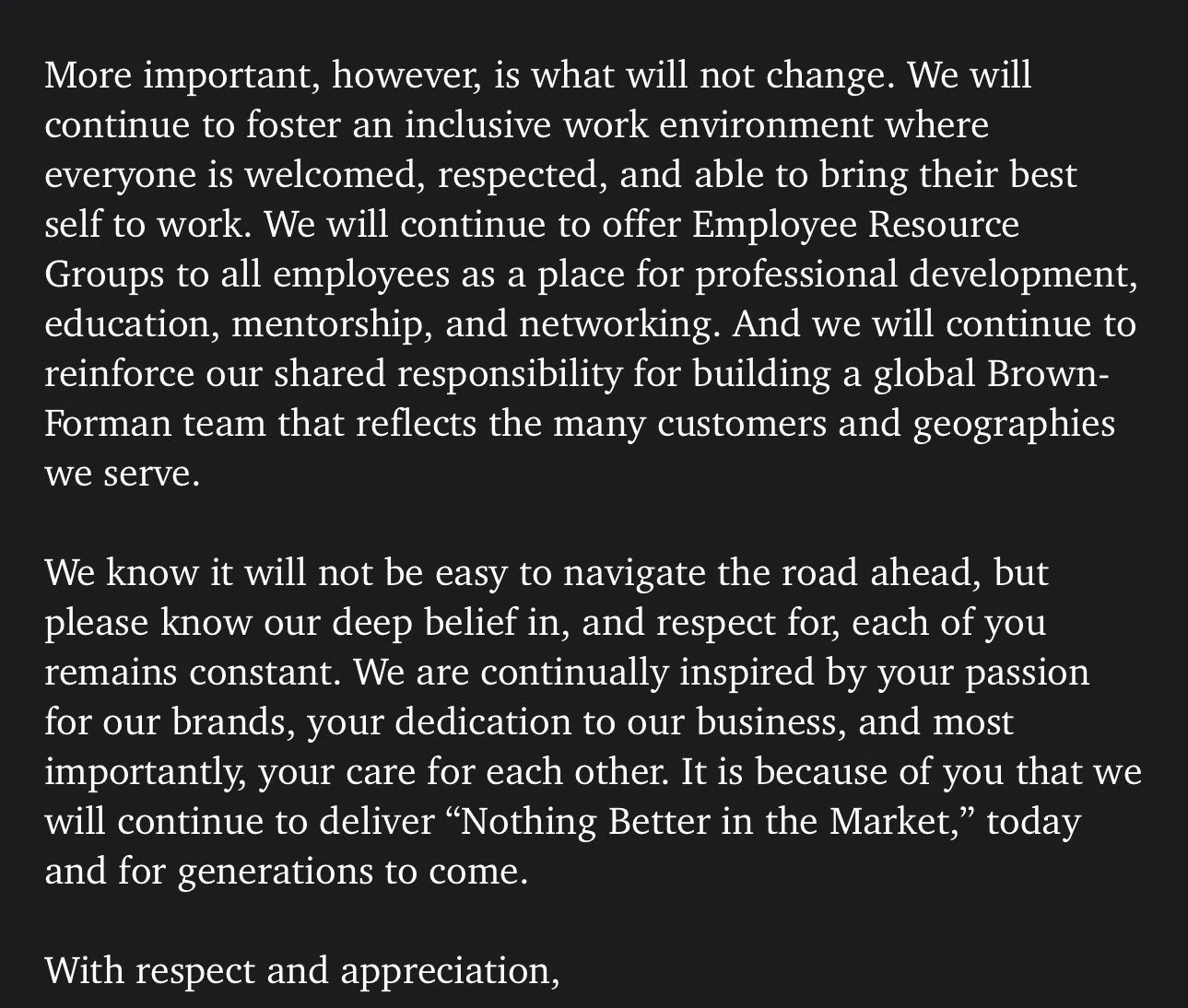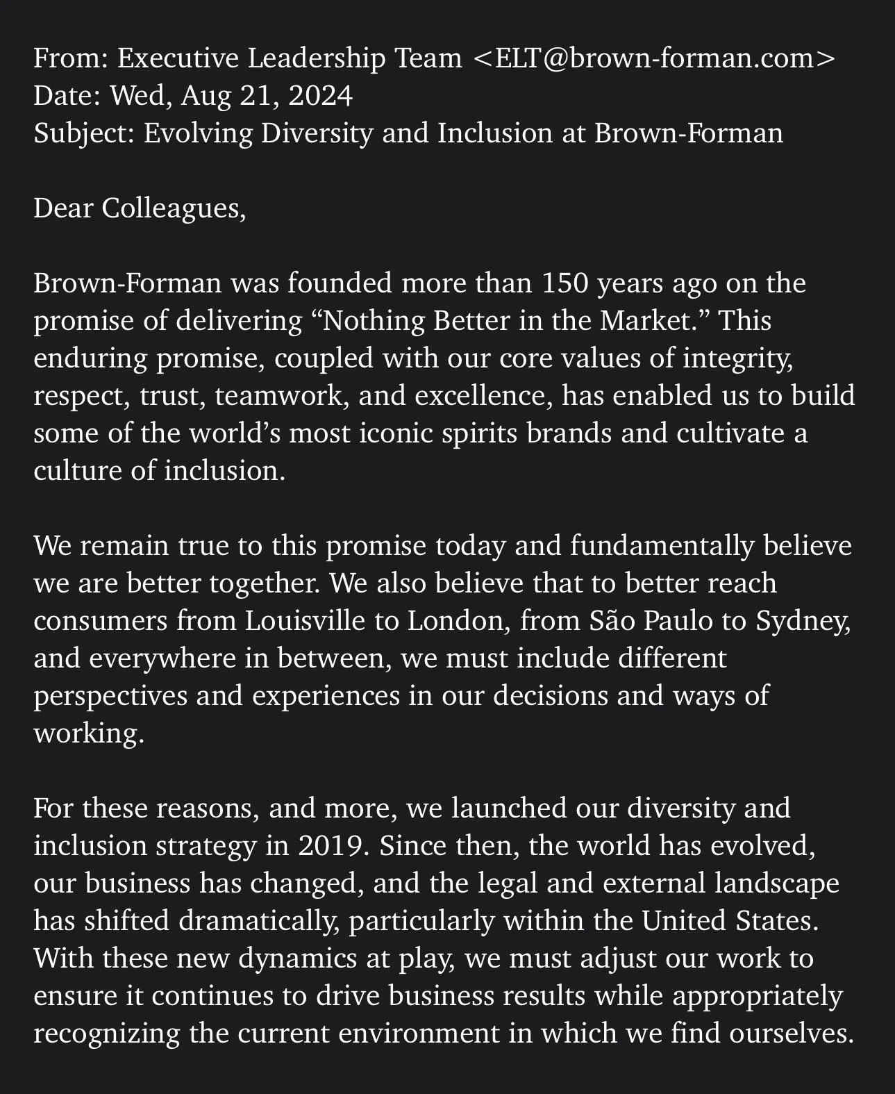 So what has Starbuck convinced Brown-Forman to do? Screenshots of the email are shared below (I reached out to Brown-Forman’s director of external communications who confirmed they are genuine), but in short three things have happened. Firstly, executive compensation is no longer linked to DEI progress. It has also removed “quantitative” (I’m reading this as ‘measurable’) DEI targets for its workforce and supply chain. This is perhaps the most disappointing part. Finally, it’s withdrawn from the Human Rights Campaign’s Corporate Equality Index survey. The Index is a US-based benchmarking tool which assesses workplace policies through an LGBTQ+ lens. Brown-Forman actually earned a perfect score from the HRC in 2023. With so much good work already done, why the u-turn now? According to the leaked email, it’s due to shifts in the “legal and external landscape” that’s developed “particularly in the United States”. As such, “with these new dynamics at play we must adjust our work”.