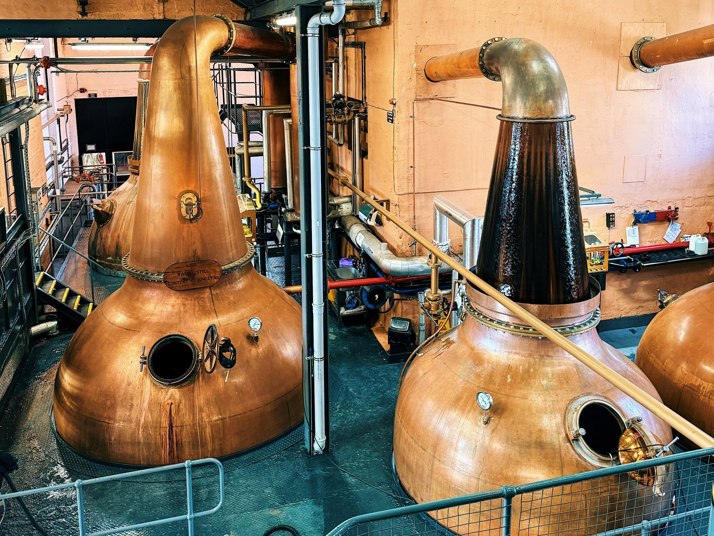 The stills at Fettercairn Distillery. The cooling ring can be seen on the right.